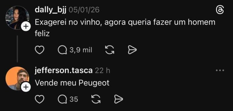 Home Entertainment 😂 10 horas ago 10 horas ago Entertainment 😂 by Sukihero 0views 795 1 😂 Fonte Post PaginationPrevious PostPreviousNext PostNext Like it? Share with your friends! 795 1 What's Your Reaction? hate 0 hate confused 0 confused fail 0 fail fun 0 fun geeky 0 geeky love 0 love lol 0 lol omg 0 omg win 0 win One Comment Cancelar respostaO seu endereço de e-mail não será publicado. Campos obrigatórios são marcados com * Salvar meus dados neste navegador para a próxima vez que eu comentar. Impressionante como eu não vejo uma unidade de ser vivo que fala bem de um Peugeot Responder