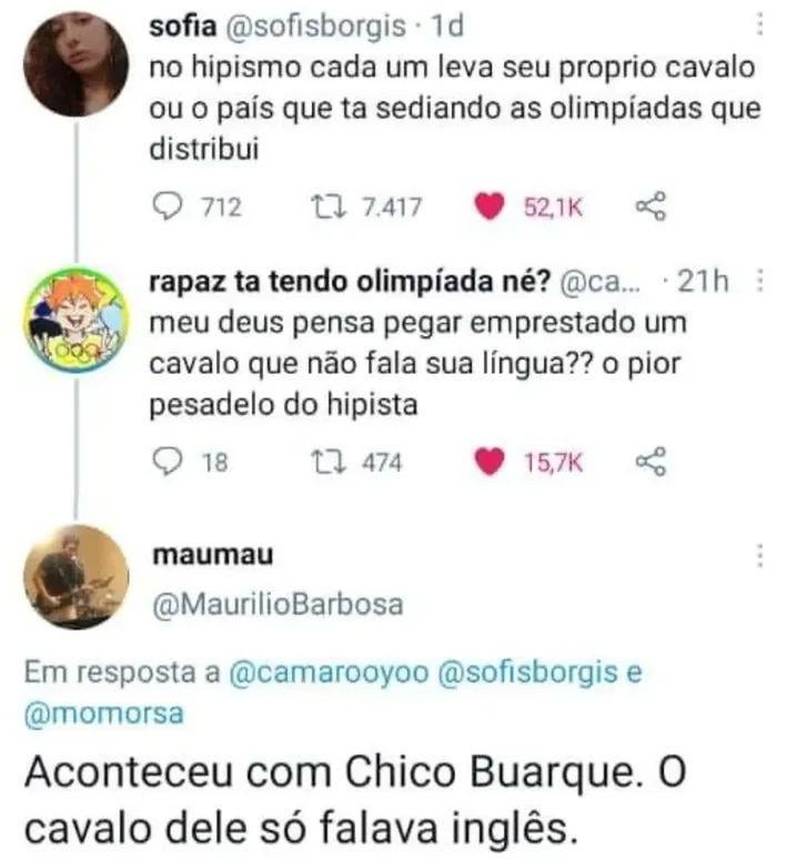Cavalo: Fala Chico Buarque: https://preview.redd.it/7p3uybh2vgde1.jpeg?width=822&format=pjpg&auto=webp&s=4985334a0079ecfac152fc1705503858337d5426 Responder