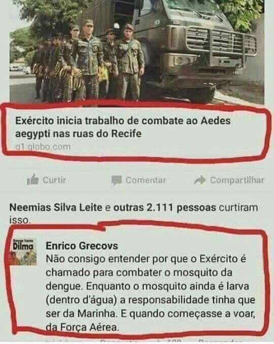 O mais triste é o nível, o Brasil está em guerra declarada contra mosquitos e nossas Forças Armadas estão perdendo! Imagina quando estivermos em guerra com humanos? 🤣