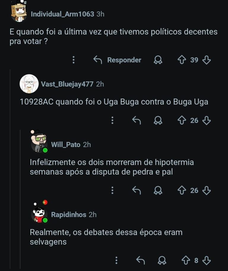 Home Entertainment Buga Uga meu presidente 2 horas ago 2 horas ago Entertainment Buga Uga meu presidente by Sukihero 0views 814 Uga Buga é um louco, principalmente com esse papo de "fogo", por que precisamos dele se temos o Gugu Dada para nós auxiliar? Fonte Post PaginationPrevious PostPreviousNext PostNext Like it? Share with your friends! 814 What's Your Reaction? hate 0 hate confused 0 confused fail 0 fail fun 0 fun geeky 0 geeky love 0 love lol 0 lol omg 0 omg win 0 win 0 Comments Cancelar respostaO seu endereço de e-mail não será publicado. Campos obrigatórios são marcados com * Salvar meus dados neste navegador para a próxima vez que eu comentar.
