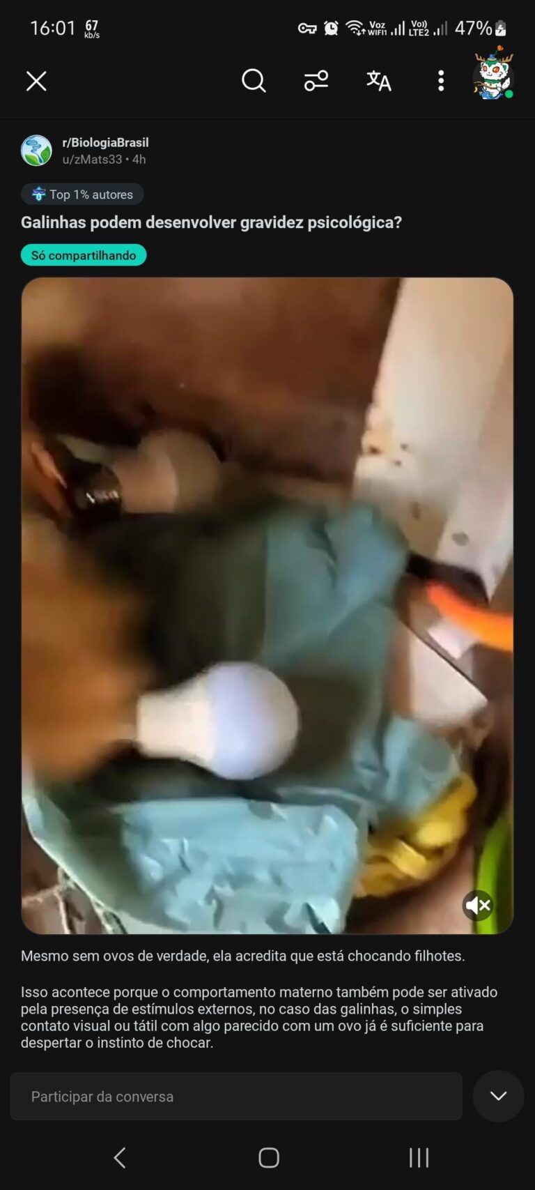 Em uma postagem mostrando um vídeo de uma galinha querendo chocar lâmpadas de led achando que eram ovos… (Passem pra próxima imagem)