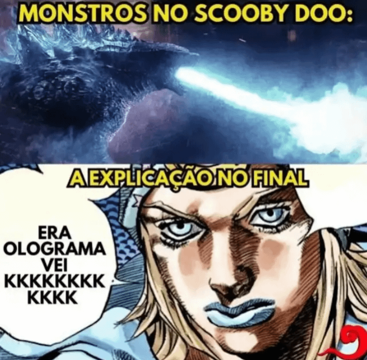 Eu lembro daquele episódio que aparecem “clones” da turma da máquina de mistério, do Fred da Daphne e Velma etc e tem cena que eles dão saltos EXTREMAMENTE ALTOS coisa de pular por cima de árvores, e daí pensei que no fim do episódio ia tar uma explicação do tipo “Eles usaram molas para pularem mais alto”, daí chega o fim do episódio e a única explicação que eles dão é: “Eles estavam usando máscaras”, tipo, foda-se que eles pularam acima da copa das árvores, qualquer humano faz isso, mó nada a ver kkkkkkj