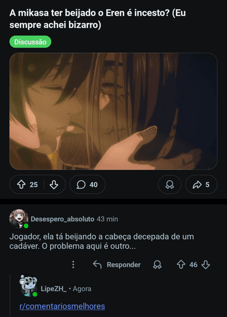 Home Entertainment Eu ri alto 14 horas ago 14 horas ago Entertainment Eu ri alto by Sukihero 0views 801 2 Eu ri alto Fonte Post PaginationPrevious PostPreviousNext PostNext Like it? Share with your friends! 801 2 What's Your Reaction? hate 0 hate confused 0 confused fail 0 fail fun 0 fun geeky 0 geeky love 0 love lol 0 lol omg 0 omg win 0 win 2 Comments Cancelar respostaO seu endereço de e-mail não será publicado. Campos obrigatórios são marcados com * Salvar meus dados neste navegador para a próxima vez que eu comentar. Esse cara aí não me é estranho… https://preview.redd.it/zmf7lfycezcg1.jpeg?width=450&format=pjpg&auto=webp&s=14bbdf815ede1af20c70fa4cd6b2d898bd767339 Não, tô vendo coisa Responder O cara leu o código penal com cu e enfiou a lore de Aot junto Responder