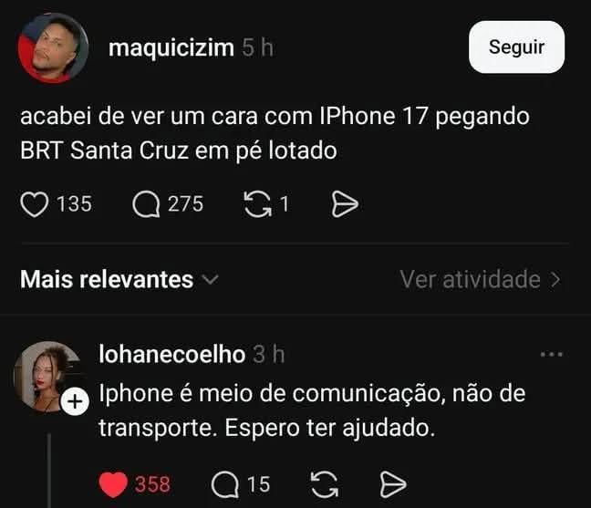 Home Entertainment iPhone 8 horas ago 8 horas ago Entertainment iPhone by Sukihero 0views 797 4 iPhone Fonte Post PaginationPrevious PostPreviousNext PostNext Like it? Share with your friends! 797 4 What's Your Reaction? hate 0 hate confused 0 confused fail 0 fail fun 0 fun geeky 0 geeky love 0 love lol 0 lol omg 0 omg win 0 win 4 Comments Cancelar respostaO seu endereço de e-mail não será publicado. Campos obrigatórios são marcados com * Salvar meus dados neste navegador para a próxima vez que eu comentar. A sabedoria que só alguém que comprou um celular de 16 mil reais e pega 4h de transporte público todo dia e já foi muito questionada por isso pode ter. Responder Tome mil grau aí ohh 🤣🤣🤣🤣 Responder Não entendi Responder TURN DOWN FOR WHAT Responder
