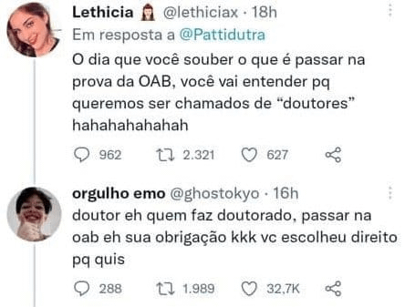 “Eu faço um teste básico de qualificação na minha profissão que só é difícil pq sou incompetente e por causa disso, tenho que ser chamado de dôtô” – Estudante médio de direito.