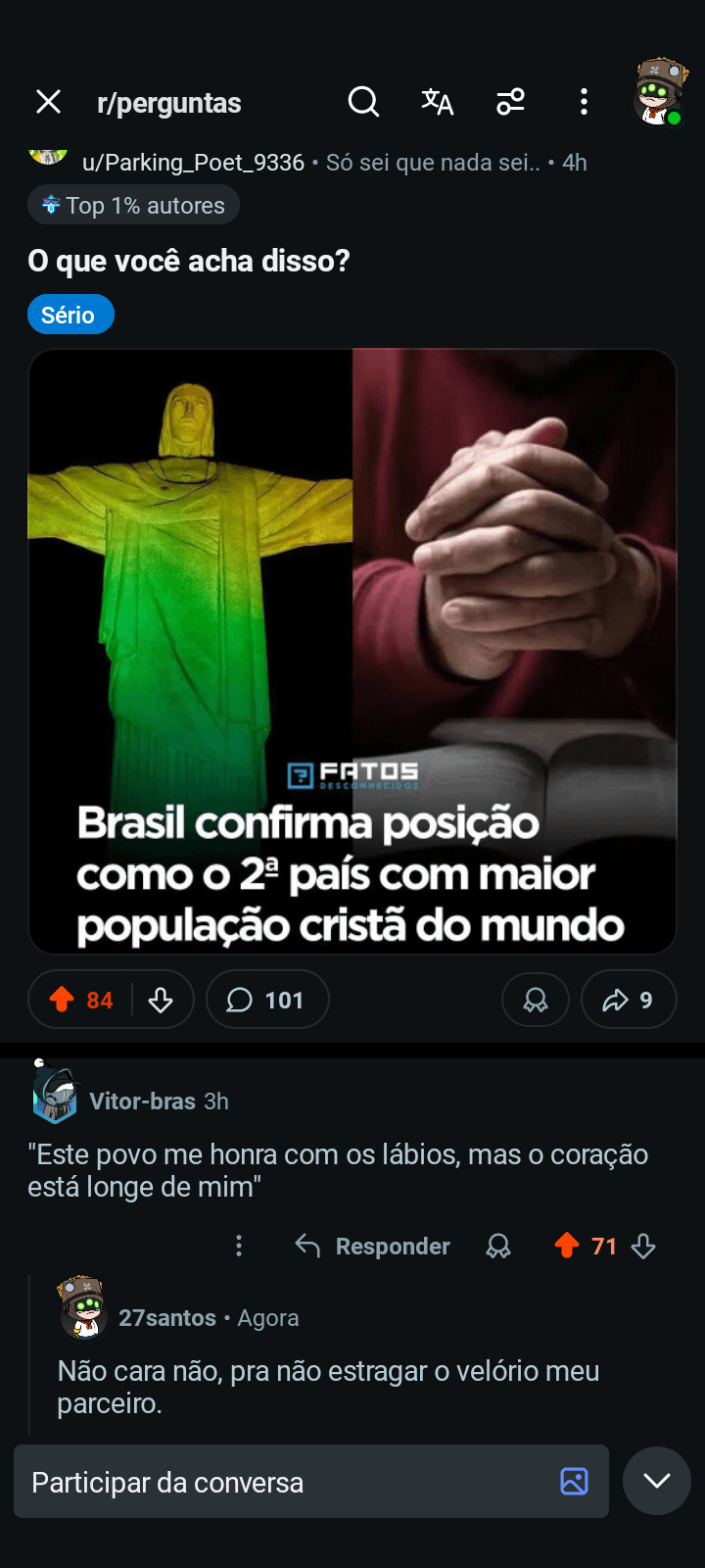 Home Entertainment O que o Brasil mais tem é cristão não praticante. 2 horas ago 2 horas ago Entertainment O que o Brasil mais tem é cristão não praticante. by Sukihero 0views 843 2 O que o Brasil mais tem é cristão não praticante. Fonte Post PaginationPrevious PostPreviousNext PostNext Like it? Share with your friends! 843 2 What's Your Reaction? hate 0 hate confused 0 confused fail 0 fail fun 0 fun geeky 0 geeky love 0 love lol 0 lol omg 0 omg win 0 win 2 Comments Cancelar respostaO seu endereço de e-mail não será publicado. Campos obrigatórios são marcados com * Salvar meus dados neste navegador para a próxima vez que eu comentar. https://preview.redd.it/h7s4jddkldfg1.png?width=444&format=png&auto=webp&s=928131fc07f2602c04b91ffb66742a9c950eeed9 Responder Crente IBGE Responder
