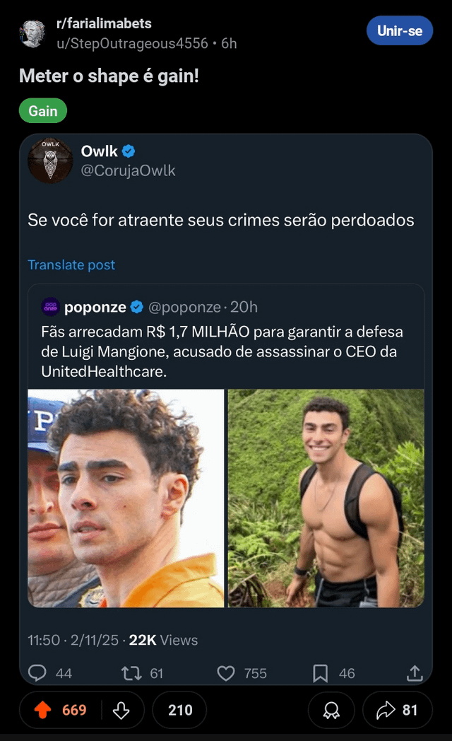 2. E a pessoa tá errada? Errado é quem é imbecil a ponto de defender um cara desse, não só eles ficam endossando em um bagulho que não é nosso ( que propriedade essa gentinha tem pra criticar quem venera Jeffrey Dahmer ou outros serial killers? ) Sem falar que isso é só um cargo, não só esse cara que morreu foi provavelmente substituído antes do funeral desse, como também o verdadeiro cabeça da organização continua lá intacto, é literalmente a mídia querendo lucrar encima de gente idiota, e o cara ainda se acha por essa resposta mais infantil e estúpida existente, tá errado tu “babar ovo” de um funcionário duma empresa ( parece que agora não aprovar assasinato é “babar ovo” ) mas você tá errado se não quase literalmente babar o ovo dessa assombração do Luigi que nem bonito é, quero que essa galera toda vá pro inferno e ele dance ciranda com o capeta e o cara que ele matou