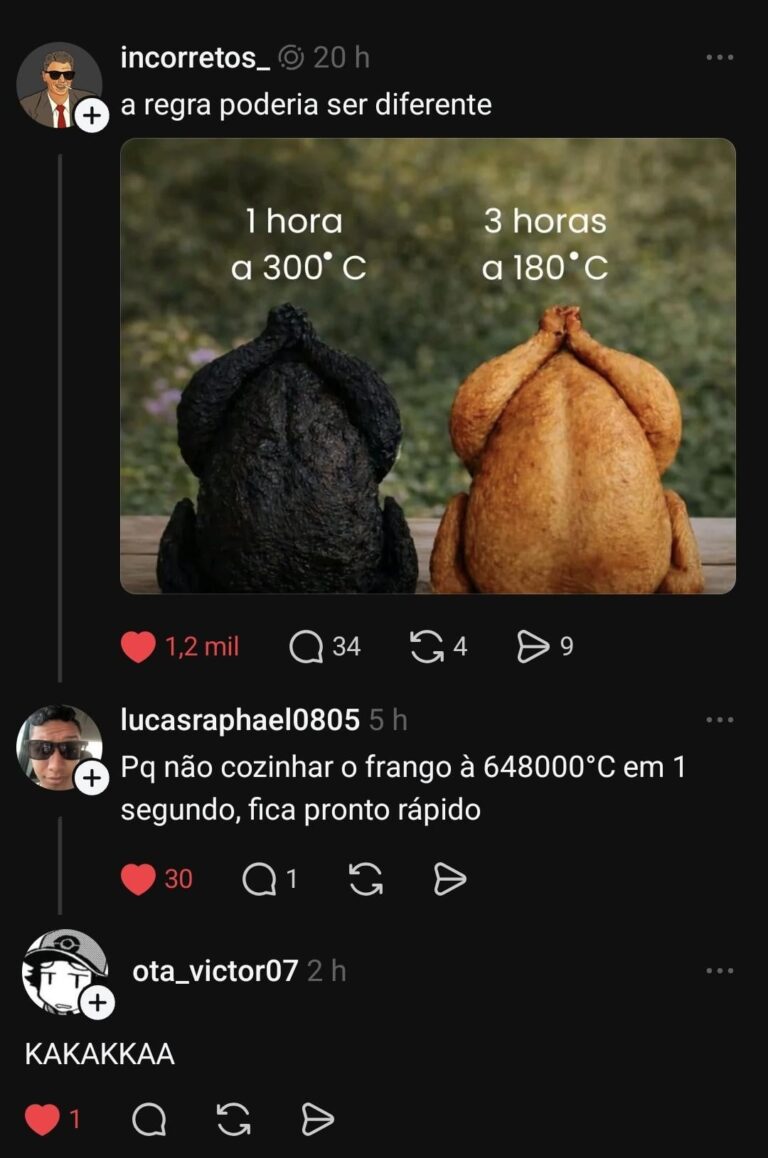 Home Entertainment Pq não cozinhar O frango 648000C em 1 segundo, fica pronto rápido 1 dia ago 1 dia ago Entertainment Pq não cozinhar O frango 648000C em 1 segundo, fica pronto rápido by Sukihero 0views 858 1 Pq não cozinhar O frango 648000C em 1 segundo, fica pronto rápido Fonte Post PaginationPrevious PostPreviousNext PostNext Like it? Share with your friends! 858 1 What's Your Reaction? hate 0 hate confused 0 confused fail 0 fail fun 0 fun geeky 0 geeky love 0 love lol 0 lol omg 0 omg win 0 win One Comment Cancelar respostaO seu endereço de e-mail não será publicado. Campos obrigatórios são marcados com * Salvar meus dados neste navegador para a próxima vez que eu comentar. É mais eficiente levar para o inferno por 1 minuto e depois voltar (só fica esperto com os 3 juízes de lá) https://preview.redd.it/n11ocr6c0scg1.jpeg?width=1280&format=pjpg&auto=webp&s=8c8cdbbda5554734cb064be87471b1a230029485 O método é mais fácil doq conjurar o sol Responder
