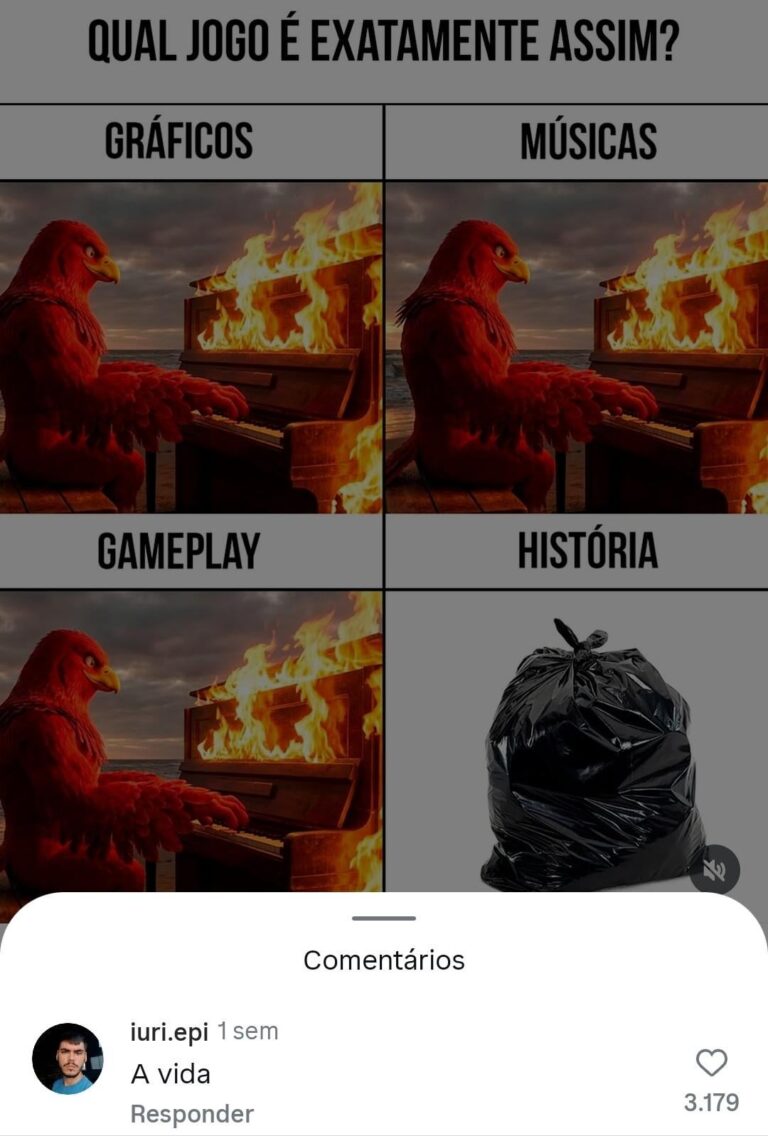 Home Entertainment Vida adulta be like 11 horas ago 11 horas ago Entertainment Vida adulta be like by Sukihero 0views 810 3 Vida adulta be like Fonte Post PaginationPrevious PostPreviousNext PostNext Like it? Share with your friends! 810 3 What's Your Reaction? hate 0 hate confused 0 confused fail 0 fail fun 0 fun geeky 0 geeky love 0 love lol 0 lol omg 0 omg win 0 win 3 Comments Cancelar respostaO seu endereço de e-mail não será publicado. Campos obrigatórios são marcados com * Salvar meus dados neste navegador para a próxima vez que eu comentar. Respondendo ao post original: Fallout 4, passei mais tempo do que devia nesse jogo e ainda me divirto, mas que história lixo… Responder Gameplay da vida nem é lá essas coisas também. Depende muito da origem do seu personagem. Responder Onde que o gameplay da vida real é boa? Só se for rico. Responder